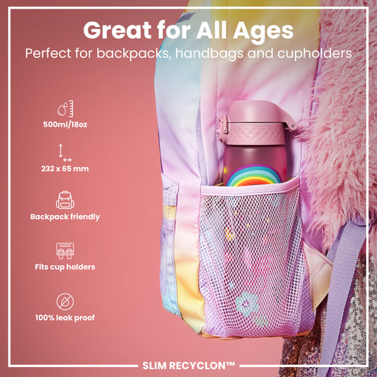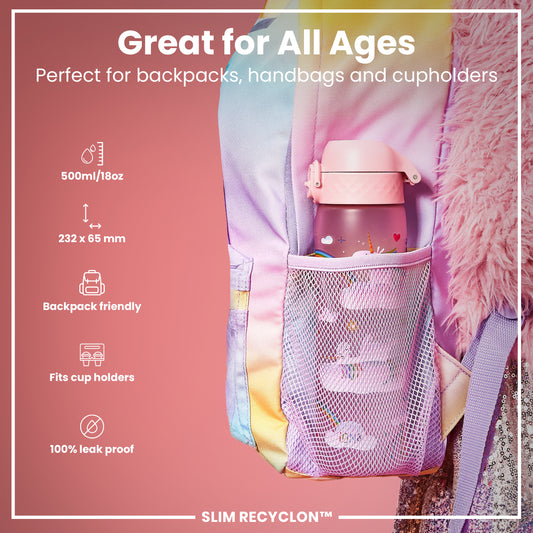 The ION8 Unicorn Water Bottle Collection—leakproof, BPA-free, and reusable. With five colors, two sizes, and three materials, these spill-proof bottles are perfect for school, sports, and daily use