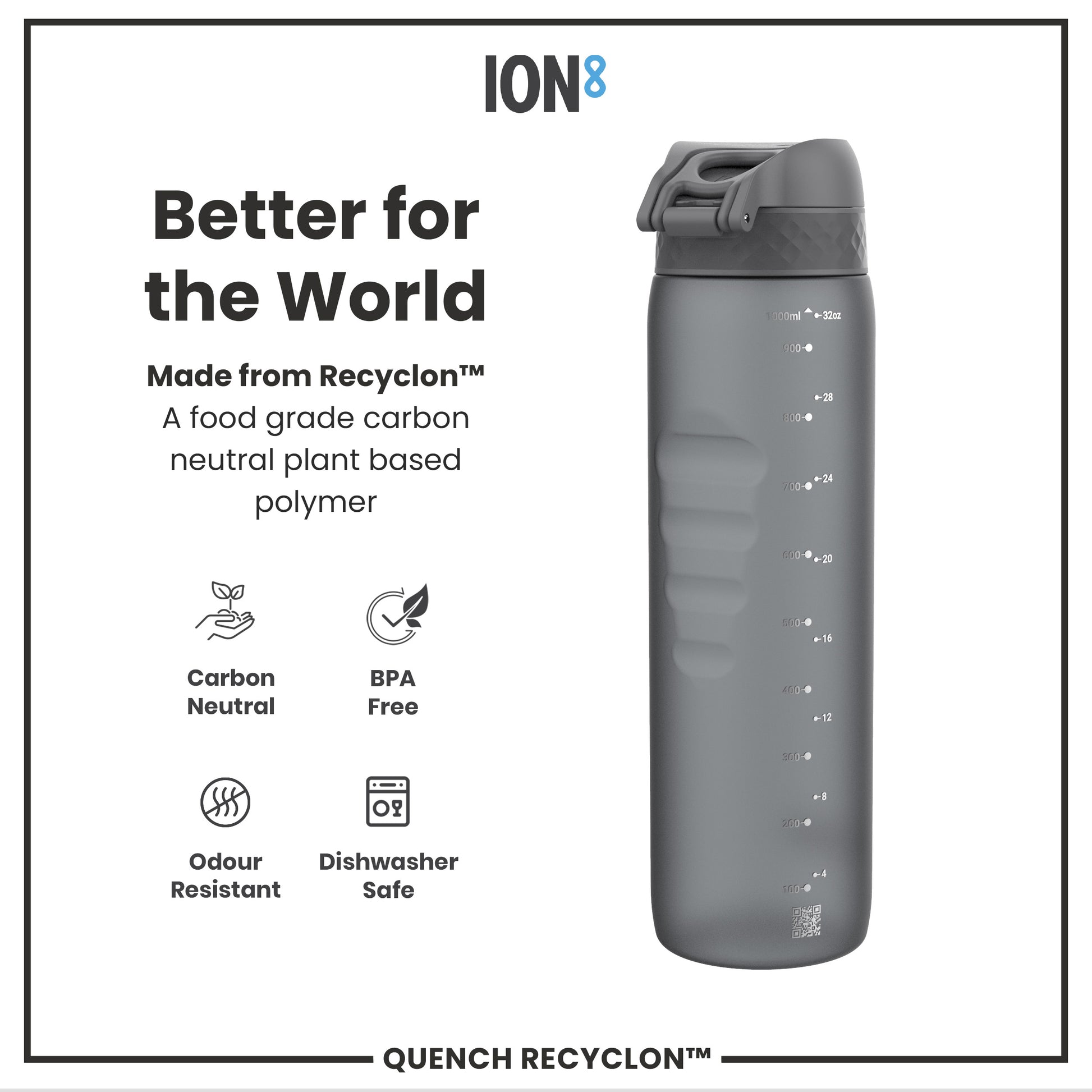 A dark-grey water bottle is held; its flip top opens one-handed. The bottle features volume markings and is shown against a dark-grey background. "One Touch. Flip top opens one-handed with a simple click. QUENCH RECYCLON™" is also present.