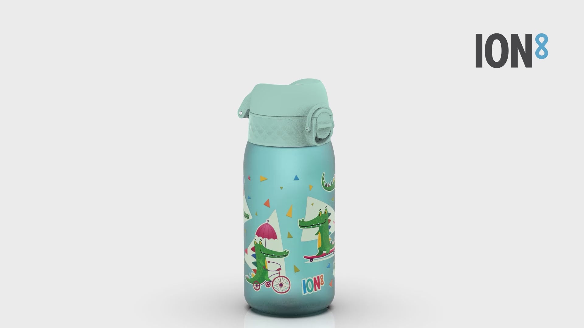 A light-blue water bottle, featuring cartoon crocodiles on bicycles and skateboards, sits on a white background. The bottle is capped and says "ION8".