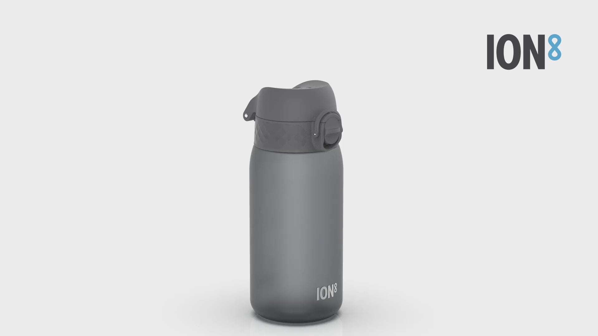 A gray water bottle sits on a white background. The bottle has a gray, hinged lid with a textured section and a rotating closure. The brand "ION8" is visible on the bottle.