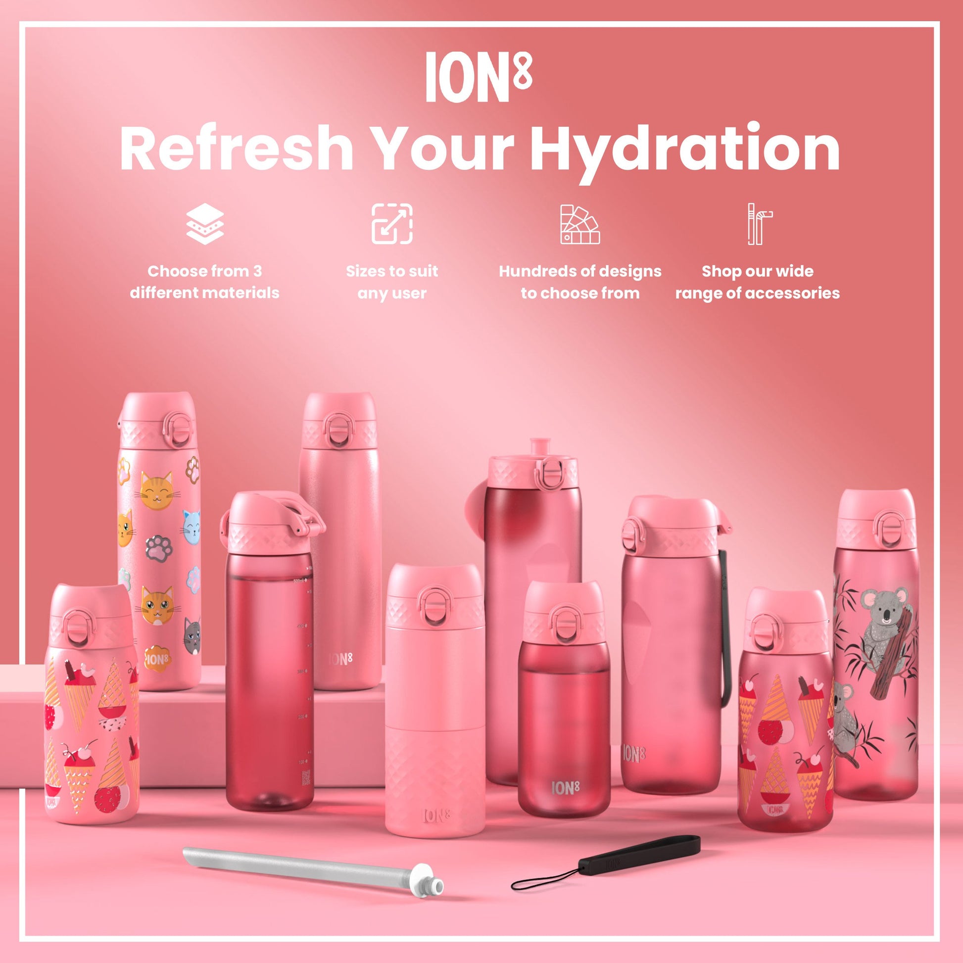 • A pink children's water bottle, featuring koala illustrations, is being held by a child wearing a pink fuzzy jacket, against a pink background.
