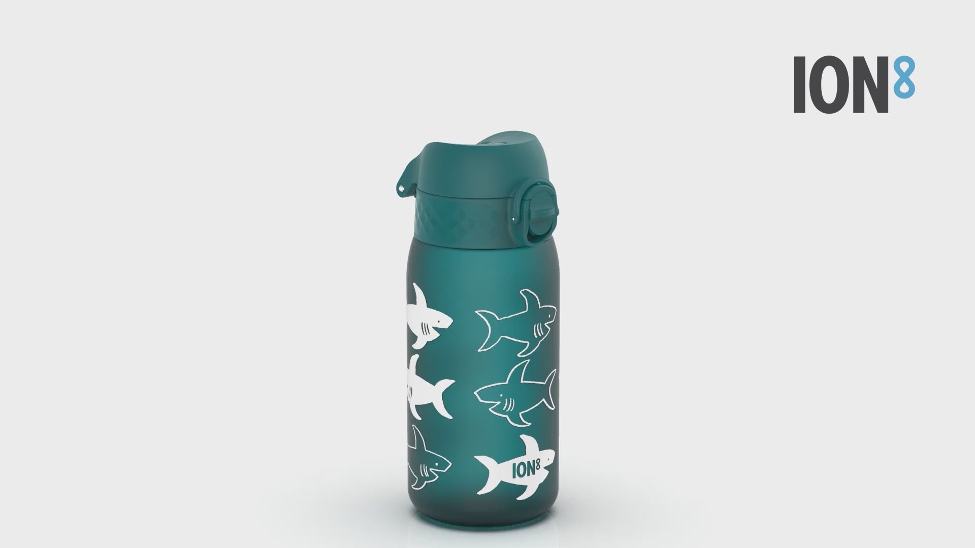 A water bottle with a full flip lid, being held, against a teal background. The lid folds back 240°. The bottle features a shark design. POD RECYCLON™ is shown.