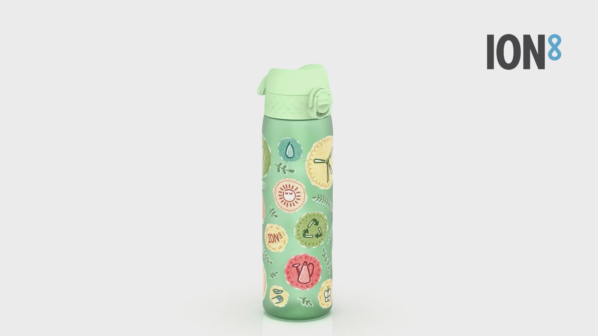 A light green water bottle stands upright, featuring a whimsical nature-themed design including suns, leaves, and recycling symbols. ION8 is visible on one of the illustrated circular patches.