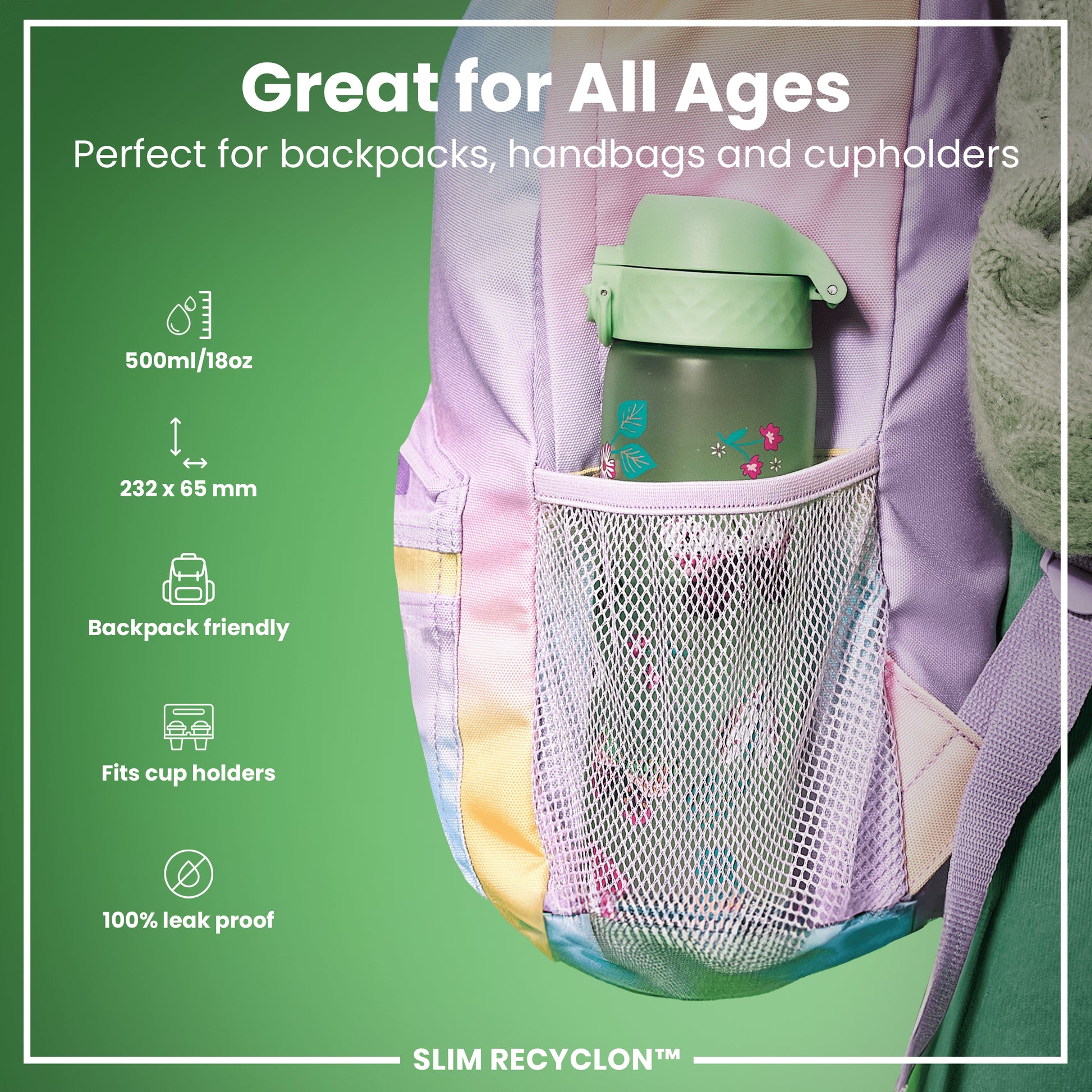 A water bottle, decorated with butterflies, is held; its flip top opens one-handed. The context is a green background. "One Touch. Flip top opens one-handed with a simple click. Flips open with a simple click. One-handed use on the go. Triple lock security. 100% leak proof - no twisting, no leaks. SLIM RECYCLON™"