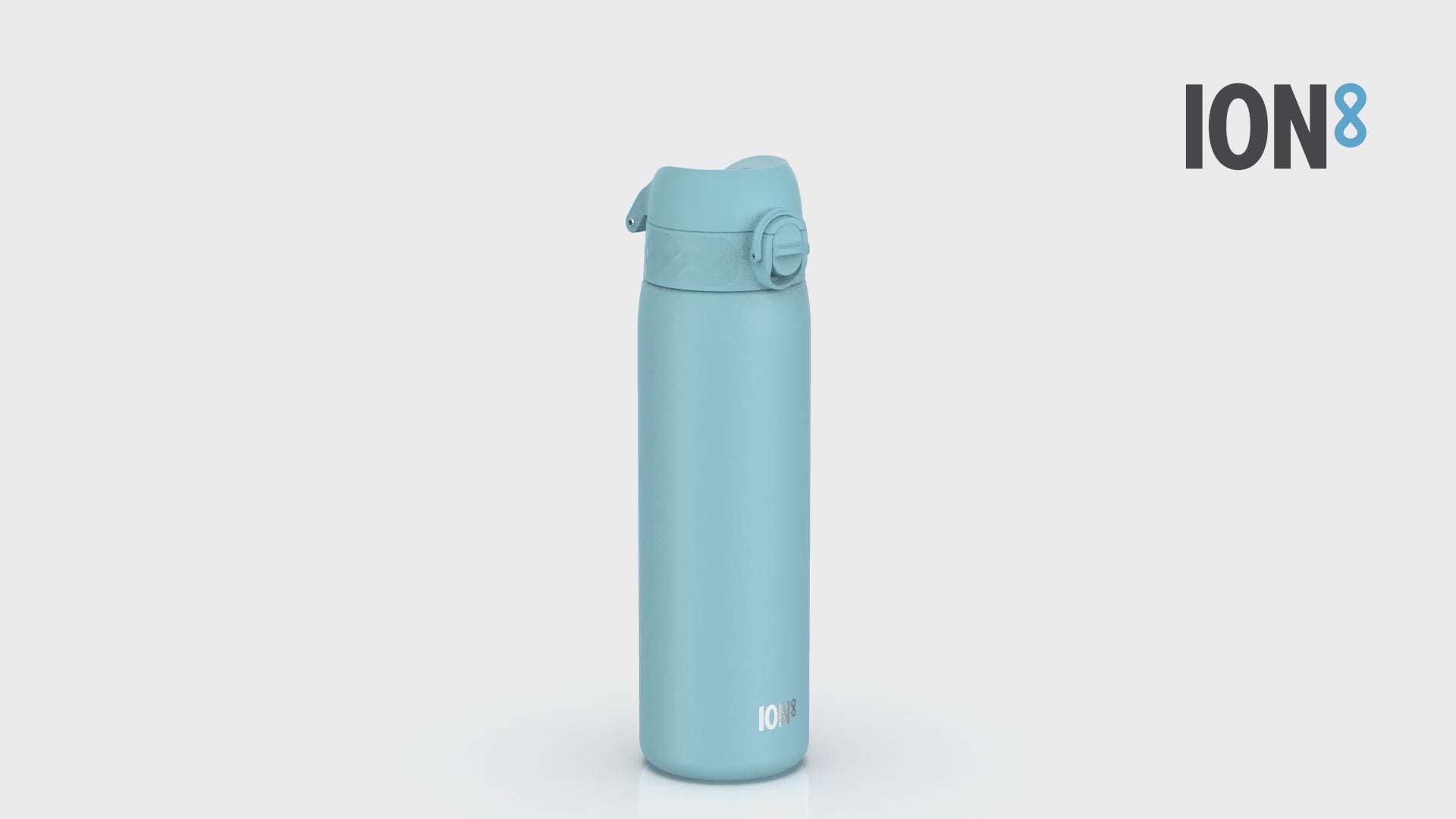 A light-blue water bottle stands upright against a white background. The bottle has a hinged lid and the word "ION8" is subtly printed near the base.