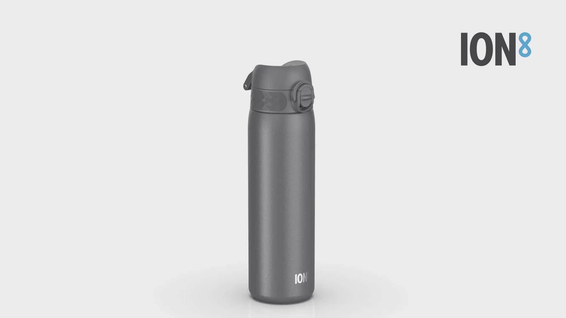A dark gray ION8 water bottle stands upright against a white background. The bottle has a textured surface and a hinged, snap-top lid.