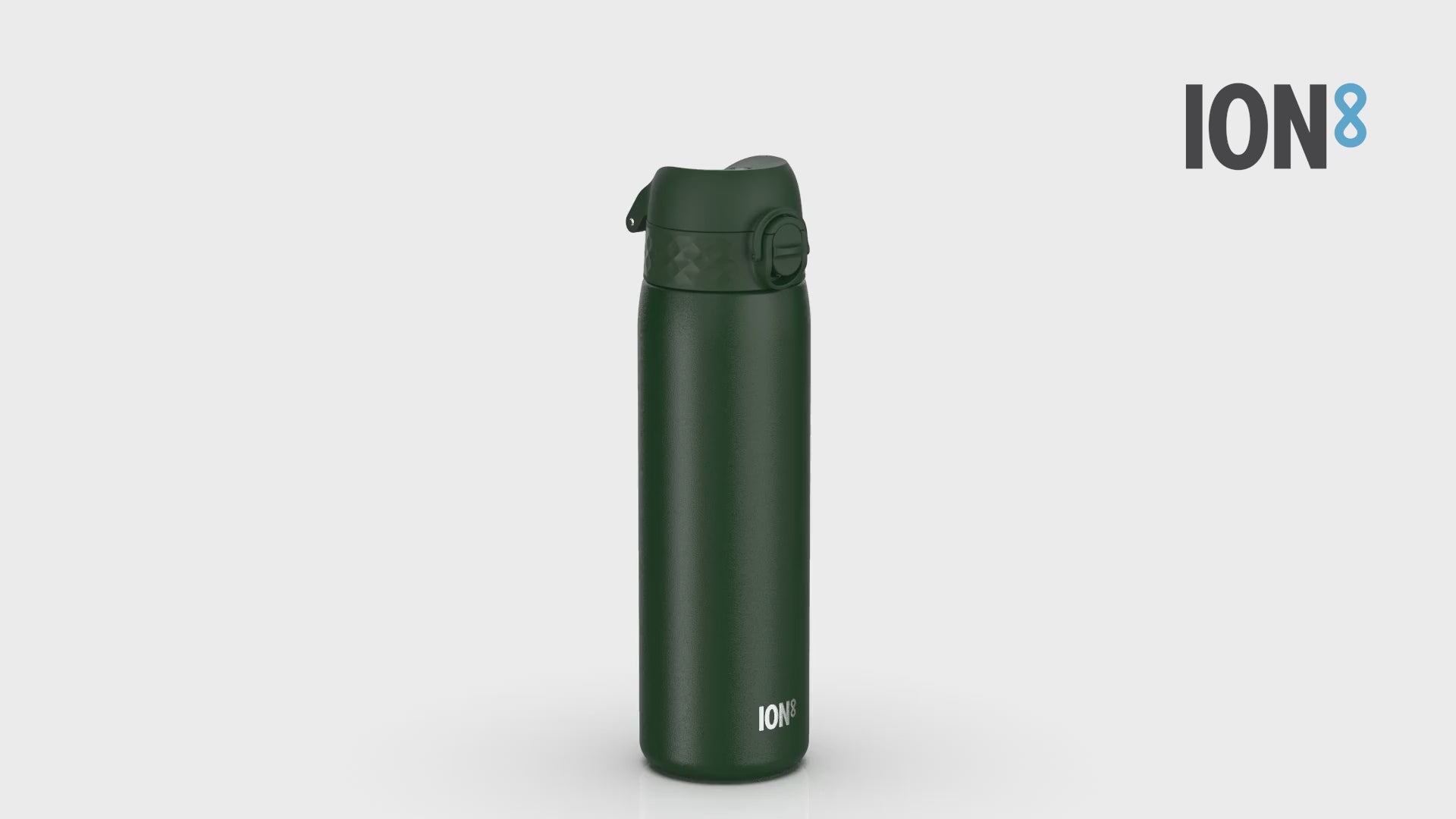 A dark-green ION8 water bottle is held; its flip top opens with a single click. The bottle is shown against a dark-green background. Flips open with a simple click; One-handed use on the go; Triple lock security; 100% leak proof - no twisting, no leaks. SLIM THERMAL.