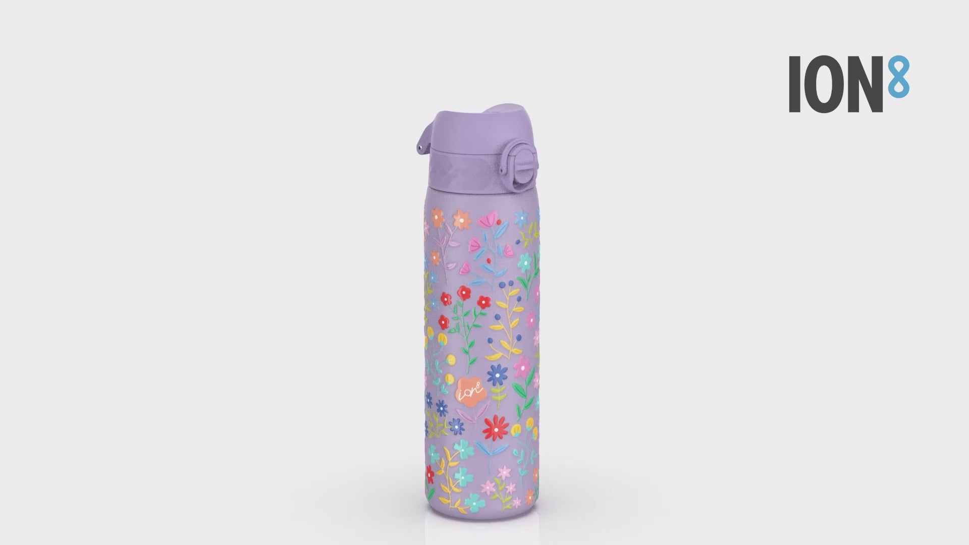 A floral-patterned, purple water bottle with a 240° opening flip lid is held; the lid folds back completely, allowing for easy drinking on the go. The bottle is slim and thermal.