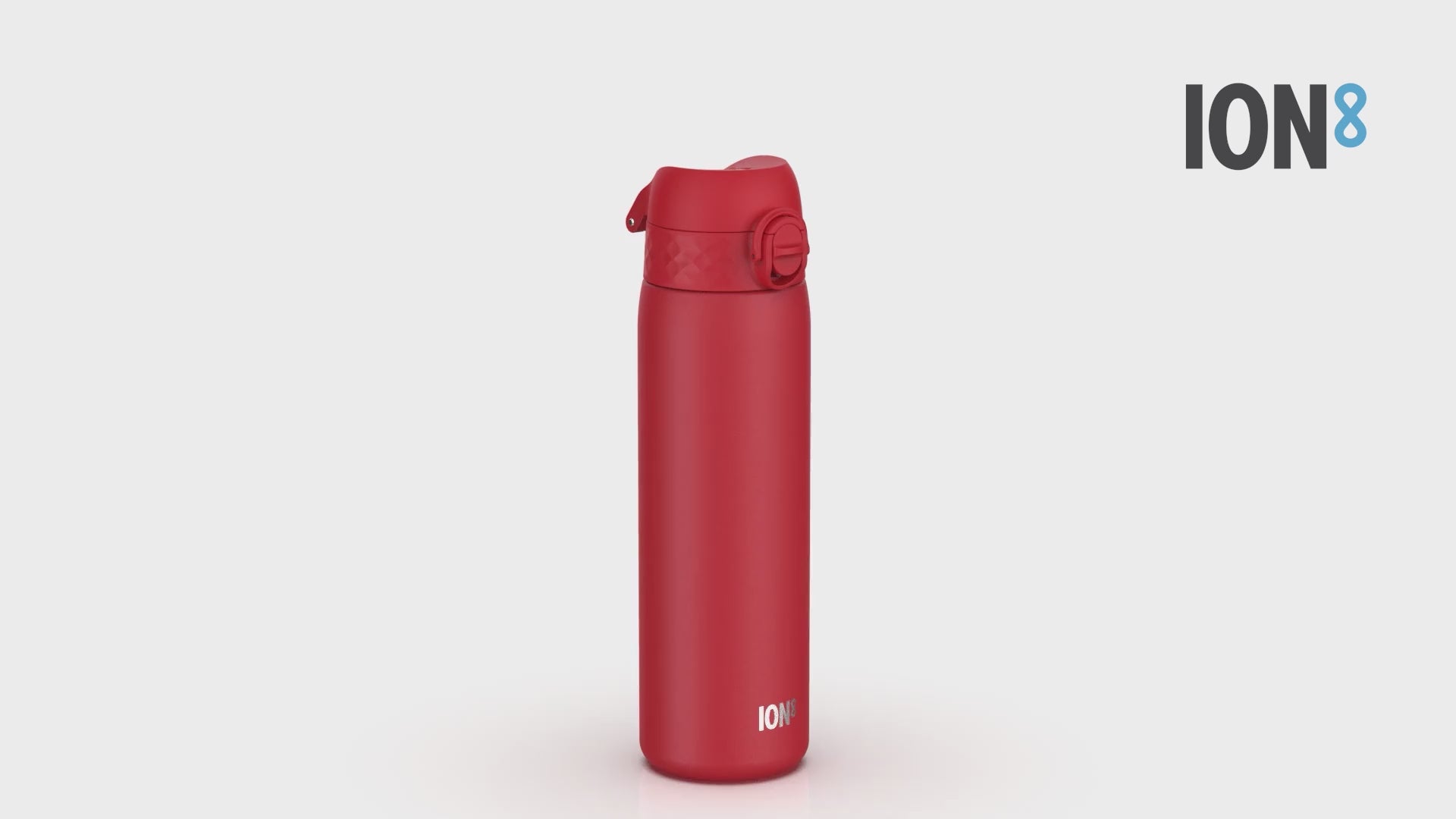 A red ION8 water bottle stands upright against a white background. The bottle has a screw-on lid with a carrying loop.