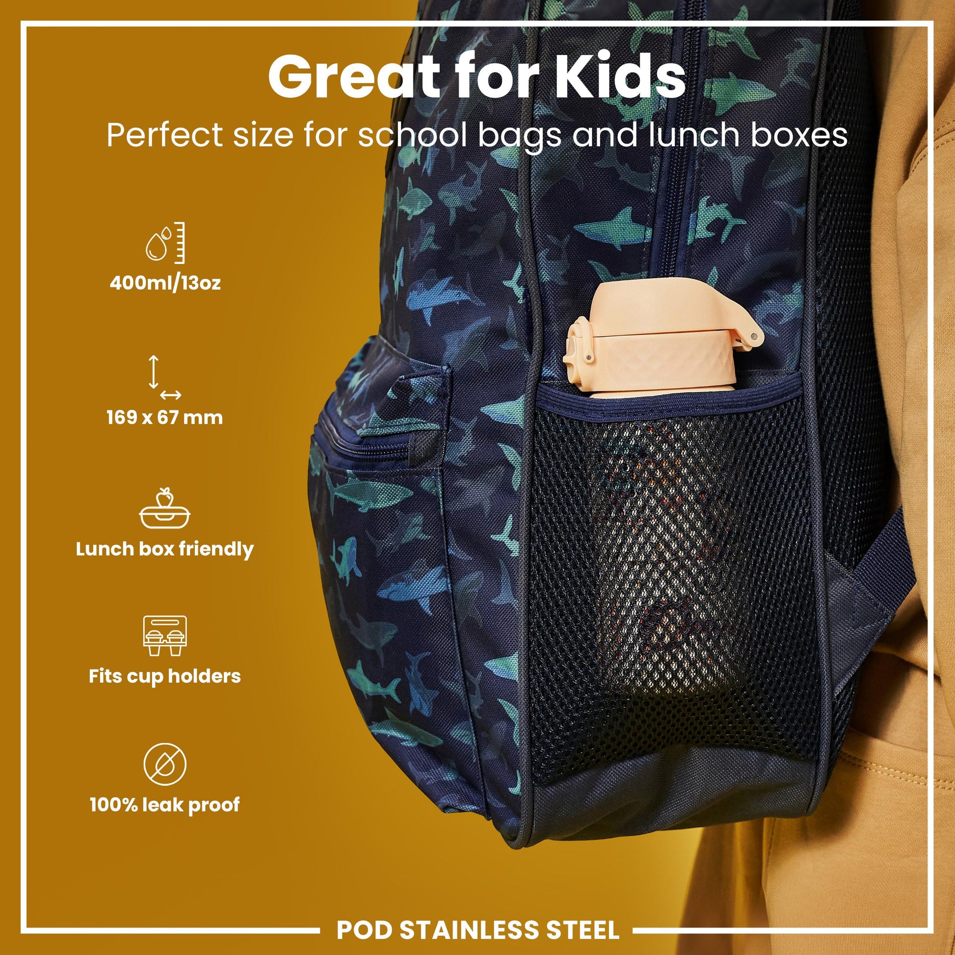 The perfect replacement for single use disposable cups. Small enough as a kids water bottle for their school lunch boxes or for smaller bags about town. The width of a soda can, it fits perfectly into all car cup holders and pockets on all backpacks.