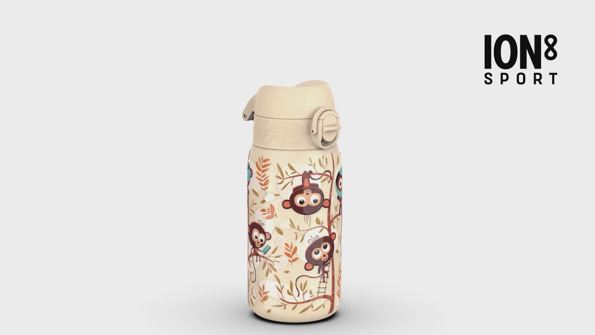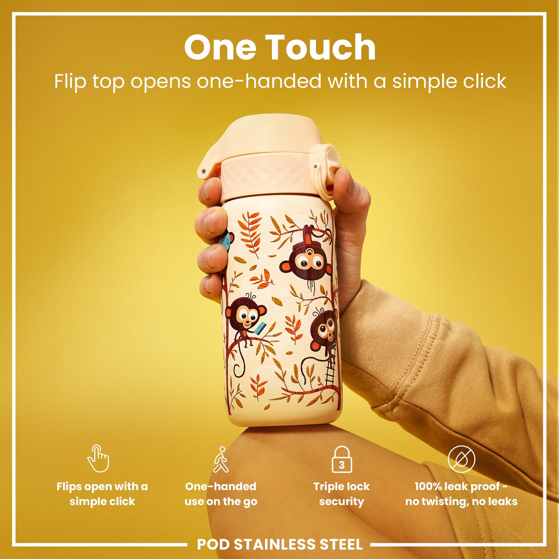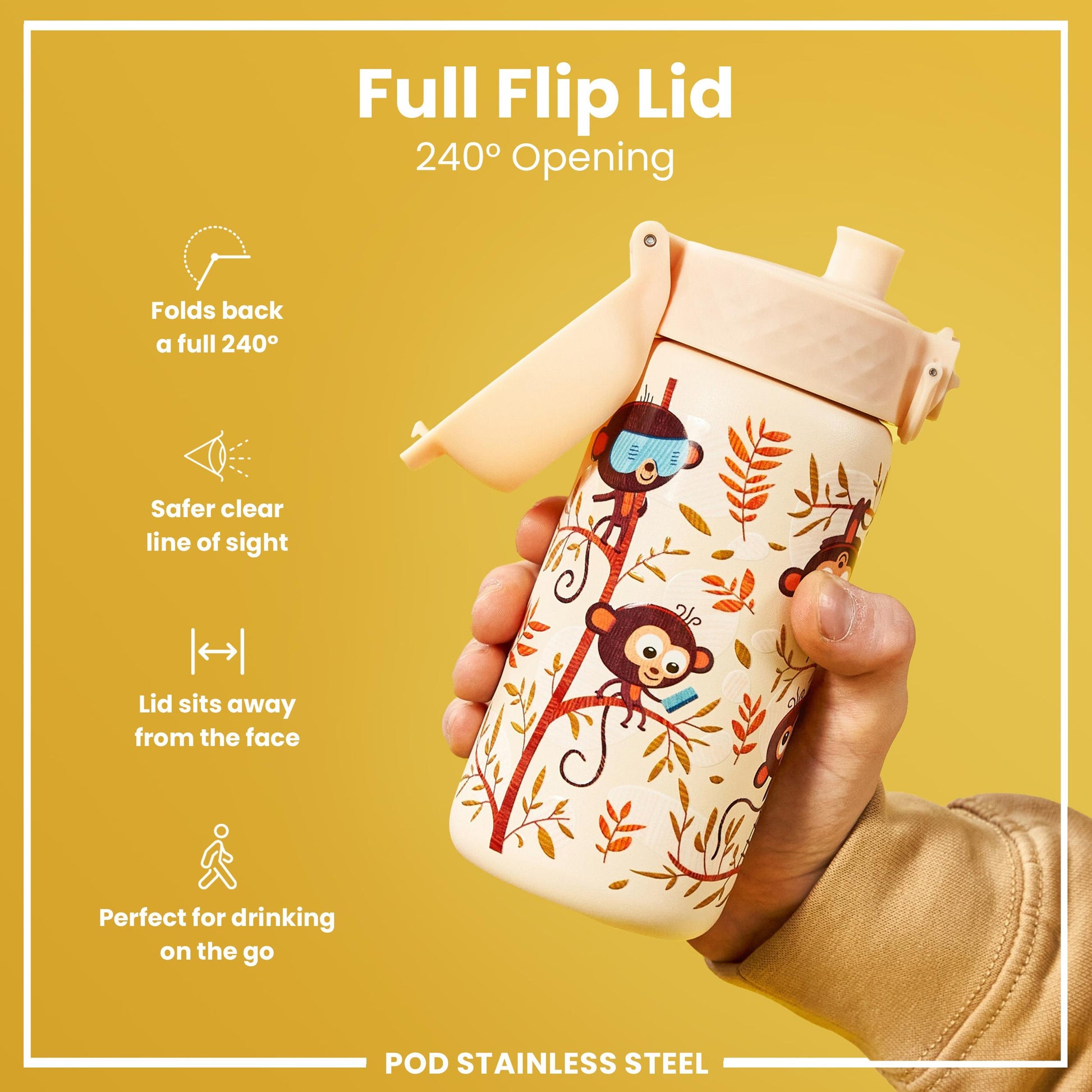 • A child's water bottle, featuring monkeys and leaves, is held in a hand against a yellow background.