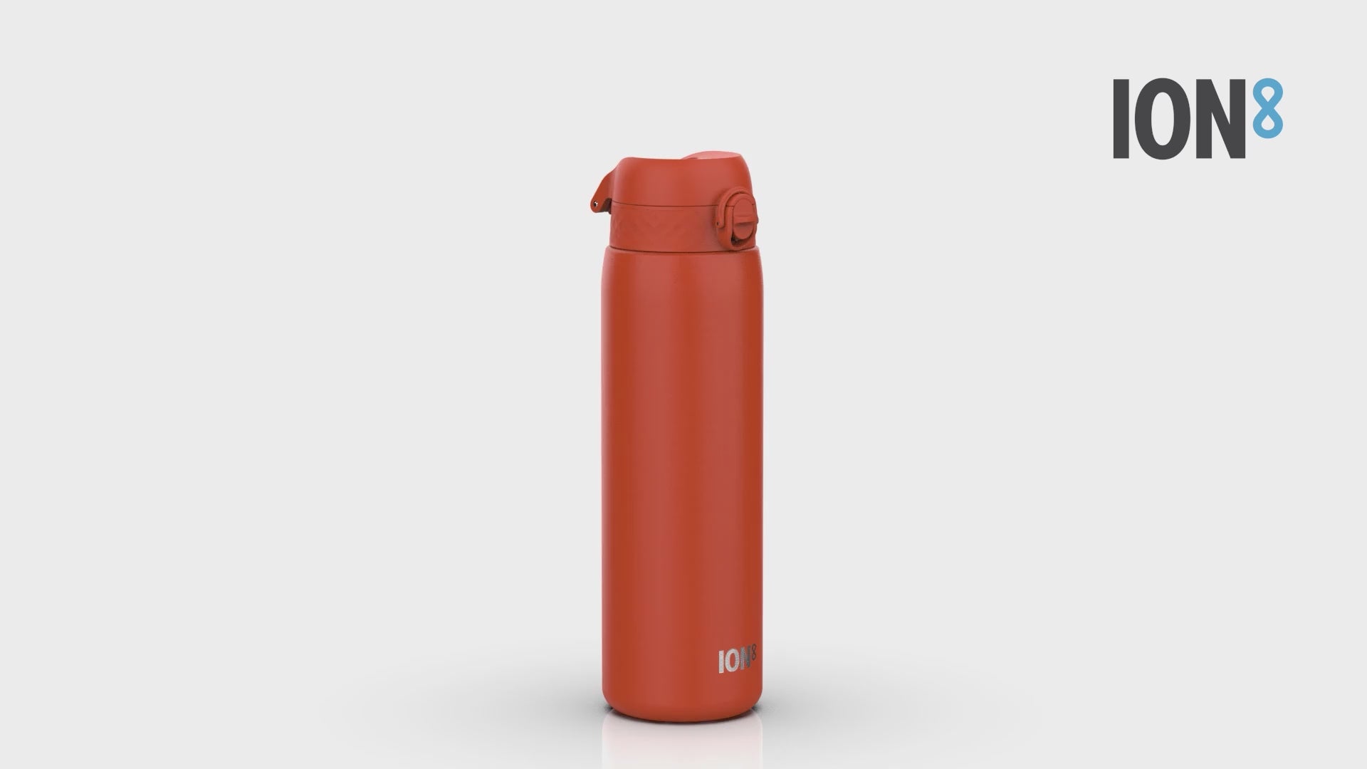 An orange water bottle stands upright against a white background. The bottle has a textured lid and the word "ION8" is printed on its side.