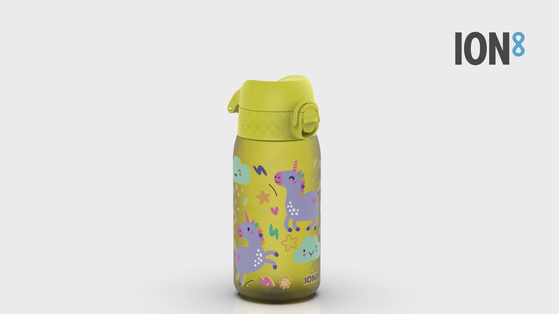 Yellow water bottle decorated with purple unicorns and smiling clouds in a playful, colorful design ION8 branding near the base with the text “ION8 LEAKPROOF”