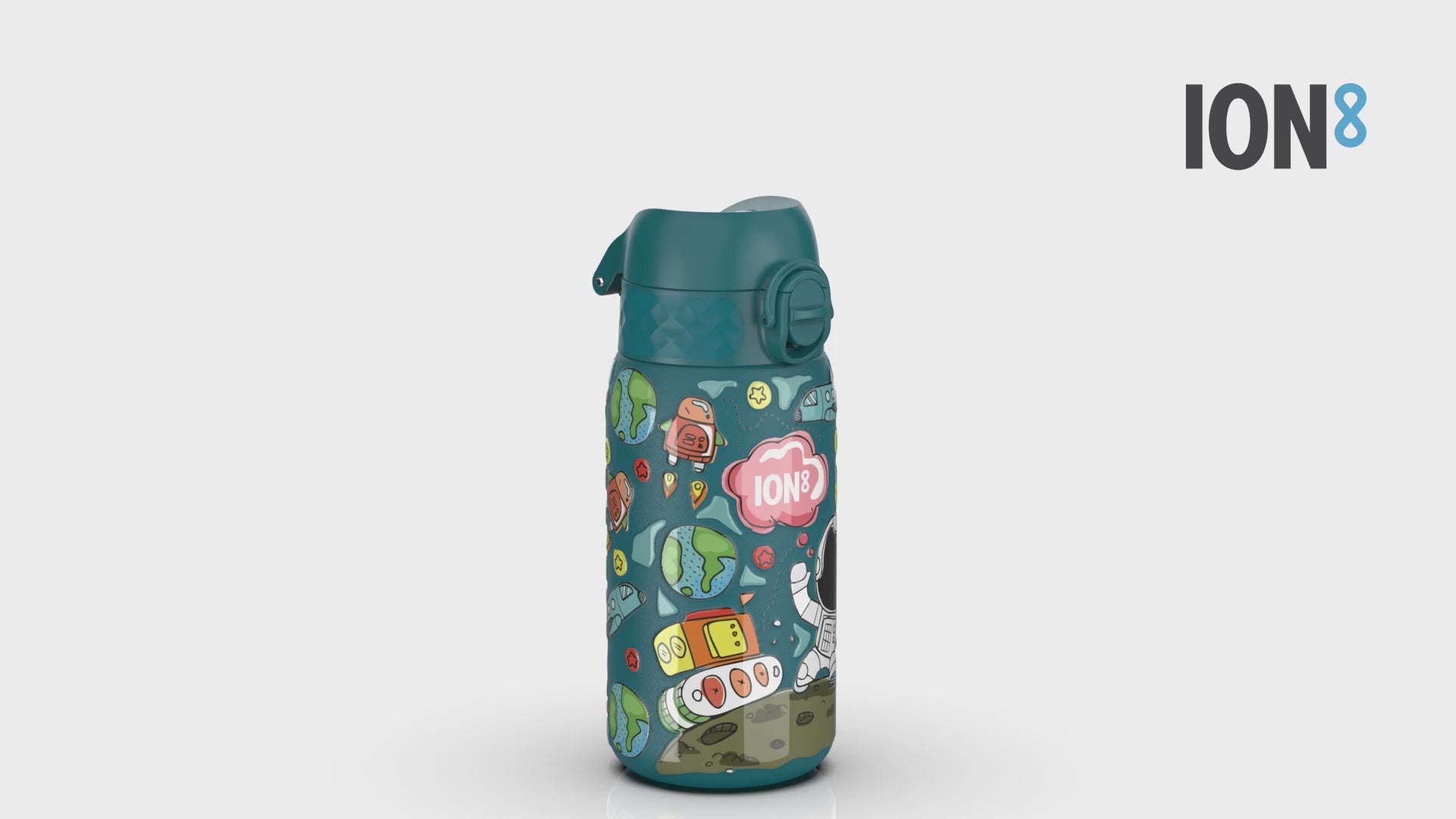 A teal water bottle, featuring a space-themed design, stands on a white background. The bottle displays drawings of planets, astronauts, and spacecraft. The brand name "ION8" is visible on the bottle.