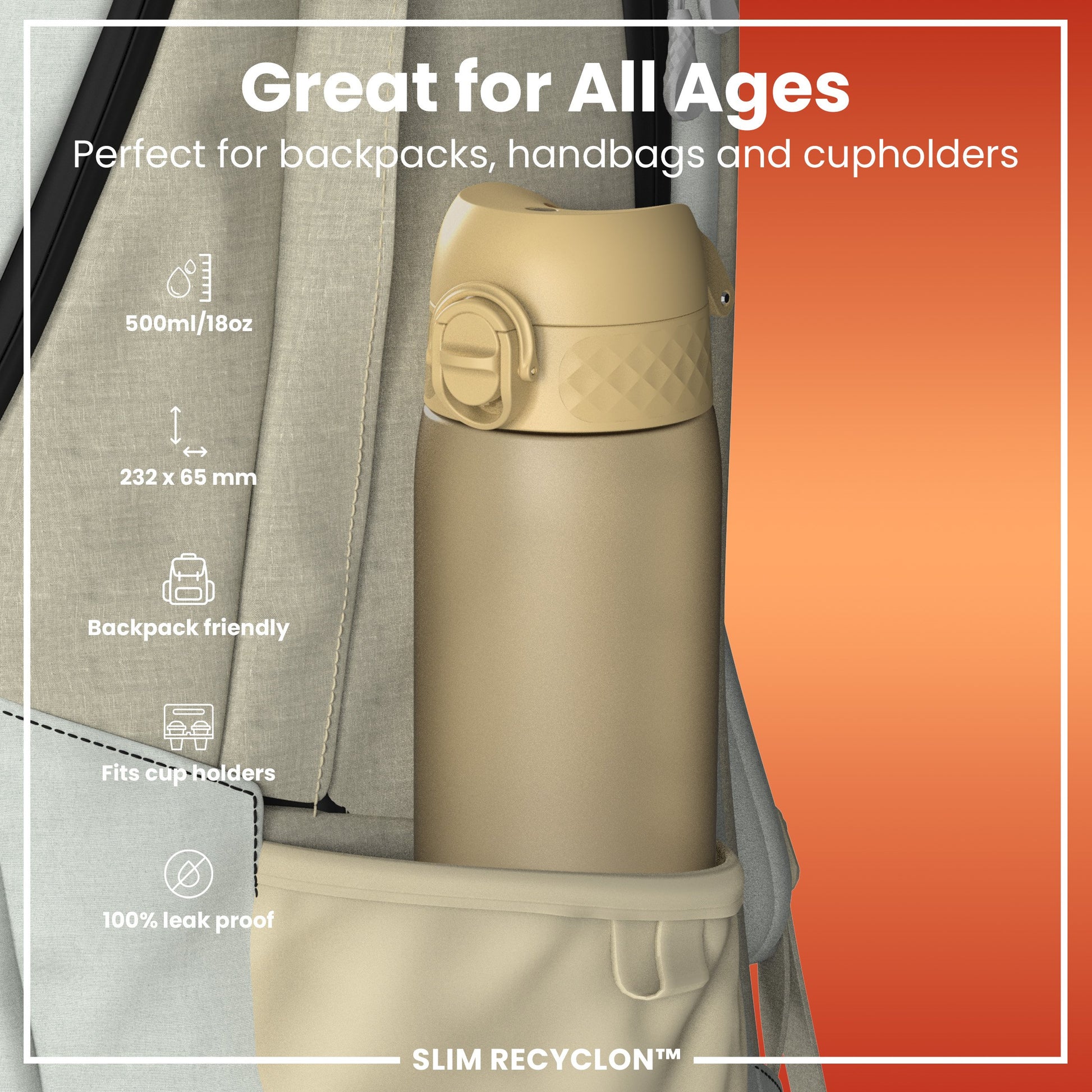 Leak Proof Slim Water Bottle, Recyclon, Desert, 500ml (18oz)