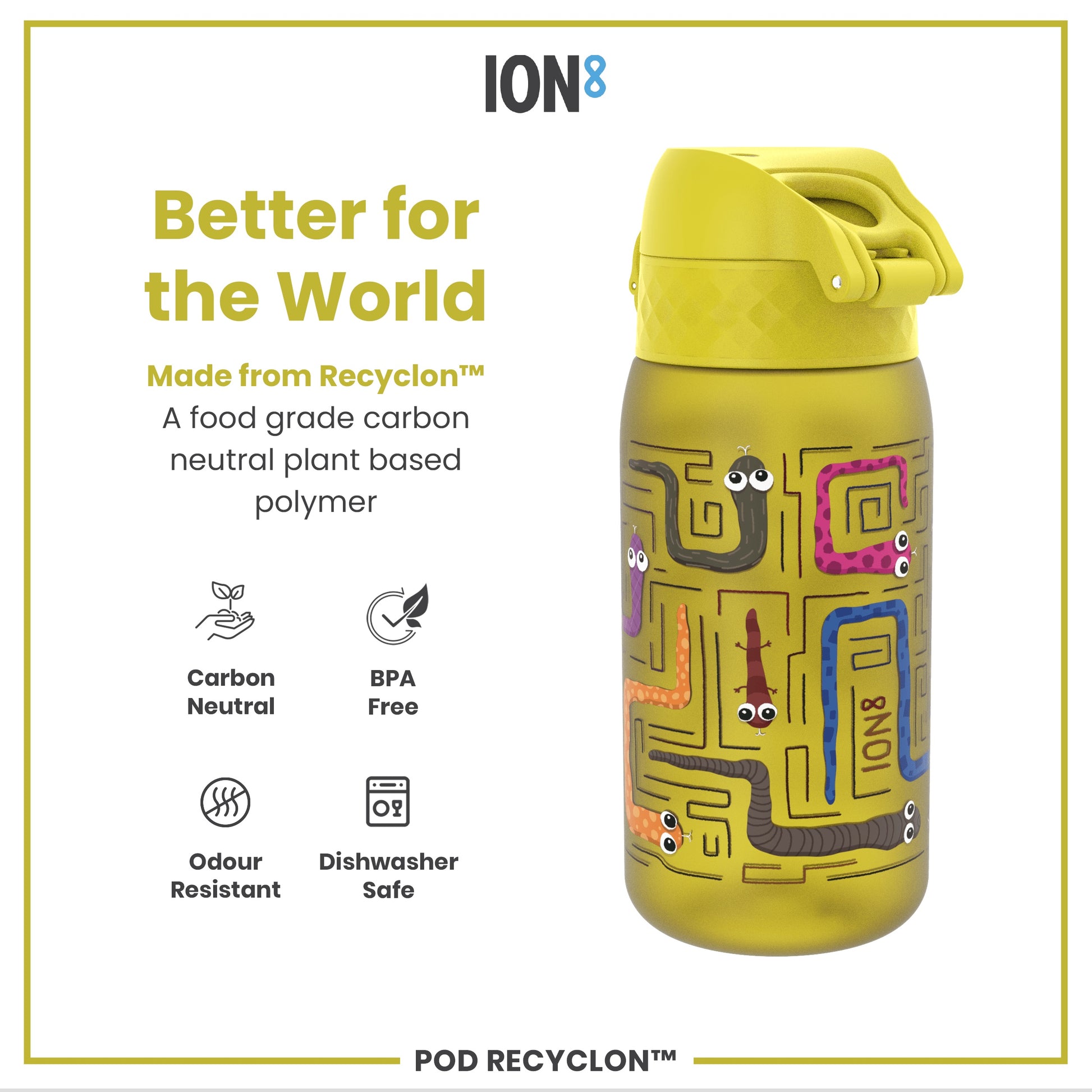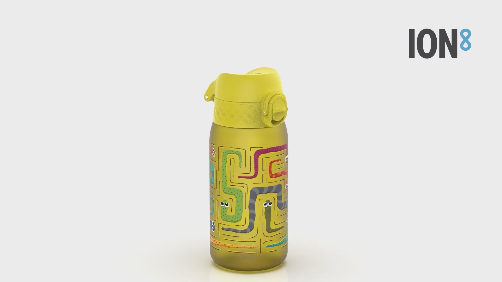 A yellow water bottle, with a full 240° flip lid, is held in a hand. The bottle features a maze design with cartoon snakes. The lid's design ensures a safer drinking experience. POD RECYCLON™