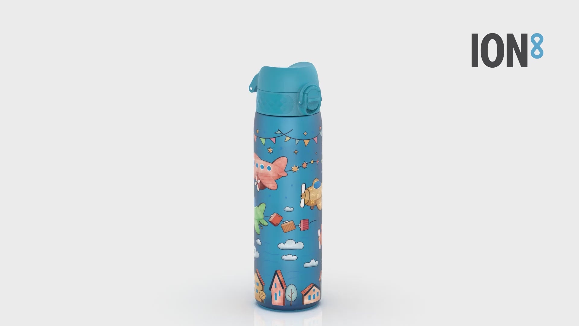 A blue water bottle, with a cartoon airplane design, is being held. Its flip top is opened one-handed. The context is a promotional image against a solid blue background. One Touch. Flip top opens one-handed with a simple click. SLIM RECYCLON™.