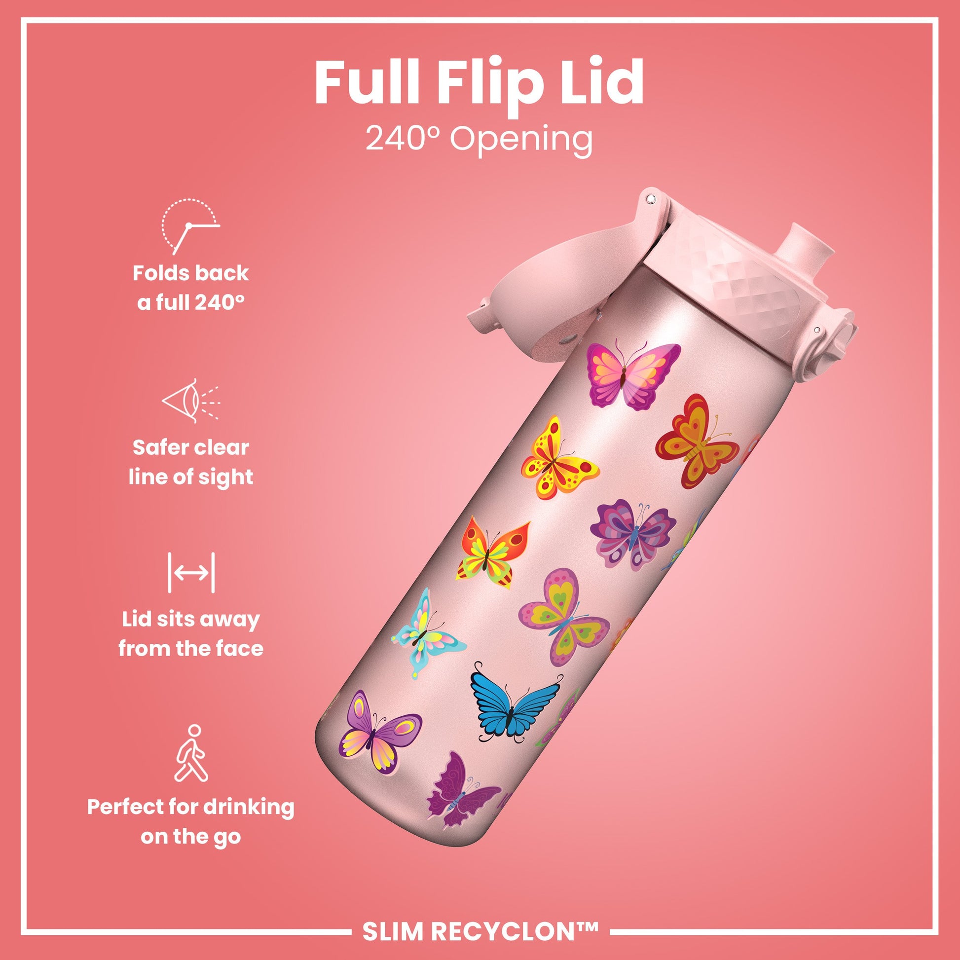 A pink water bottle covered in colorful butterfly patterns stands upright against a white background It features a flip-top lid Text on it reads ION8 Leak Proof