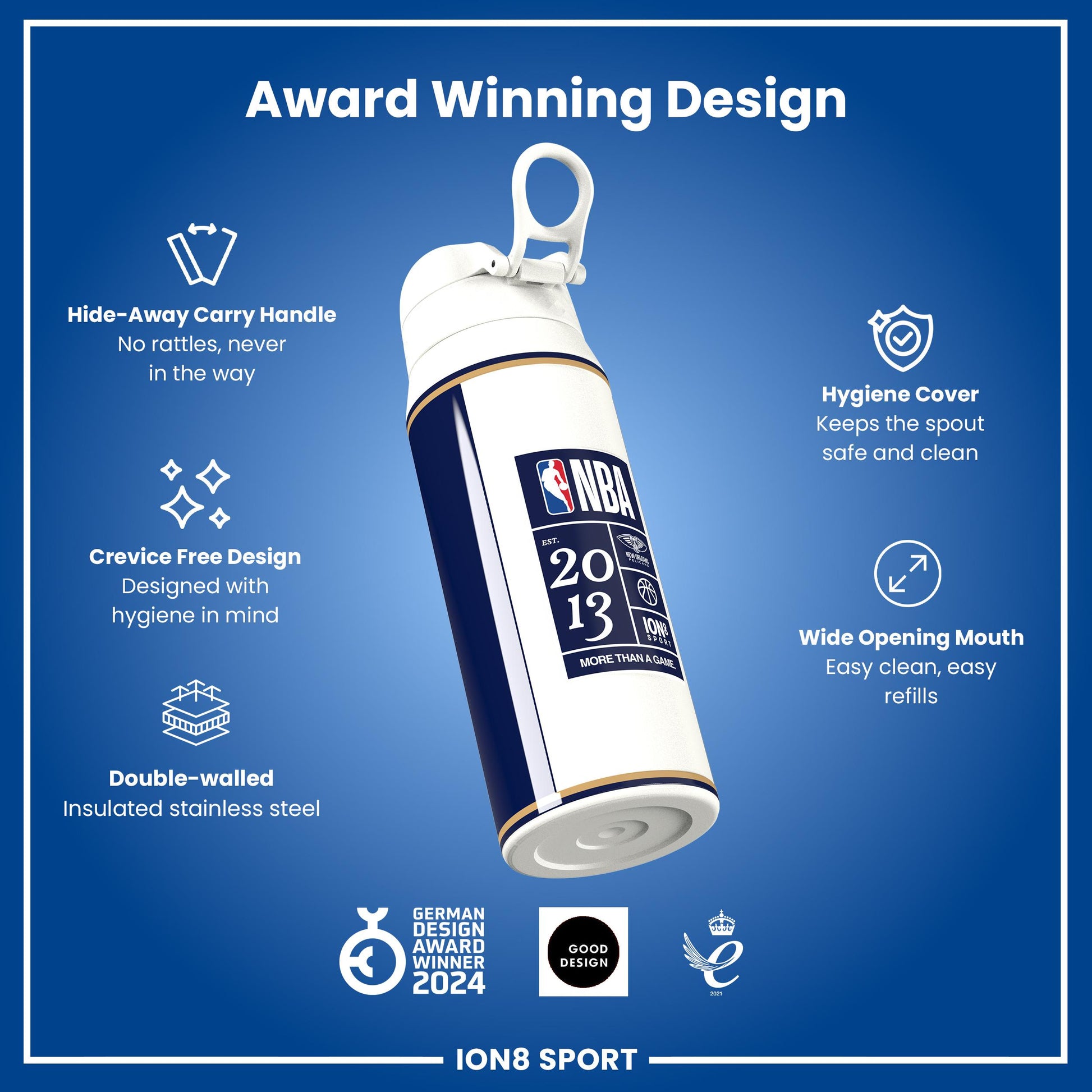 Raise your game with the Official NBA Thermal Insulated Bottle by ION8. Designed to meet the uncompromising standards of NBA, this 750ml double-wall stainless steel bottle combines premium performance with unmistakable NBA pride.